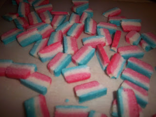 The only tricky part of this recipe is that you must work quickly when forming the ropes and getting them to stick together. Some of my ropes wouldn't stick together because they hardened too quickly and I ended up with candy corns with tips that would fall off. I also made a couple shorter ropes as opposed to one long rope so it was easier to handle. The last rope I really smashed together and then just sliced it like a block of cheese to get some rectangle shaped candy corn with stripes which I thought was appropriate for a red, white, & blue treat!